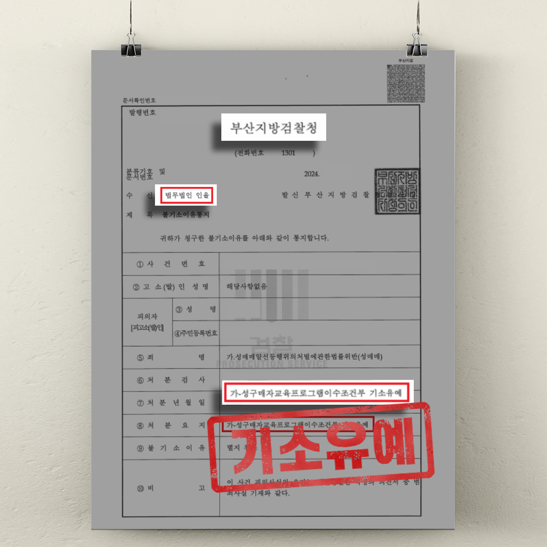 이에 경찰은 본 변호인의 의견을 받아들여 아청법위반이 아닌 성매매알선등행위의처벌에관한법률위반으로 검찰에 송치하였습니다. 또한 검사는 정상자료를 참작하여 의뢰인에게 교육조건부기소유예 처분을 내렸습니다.